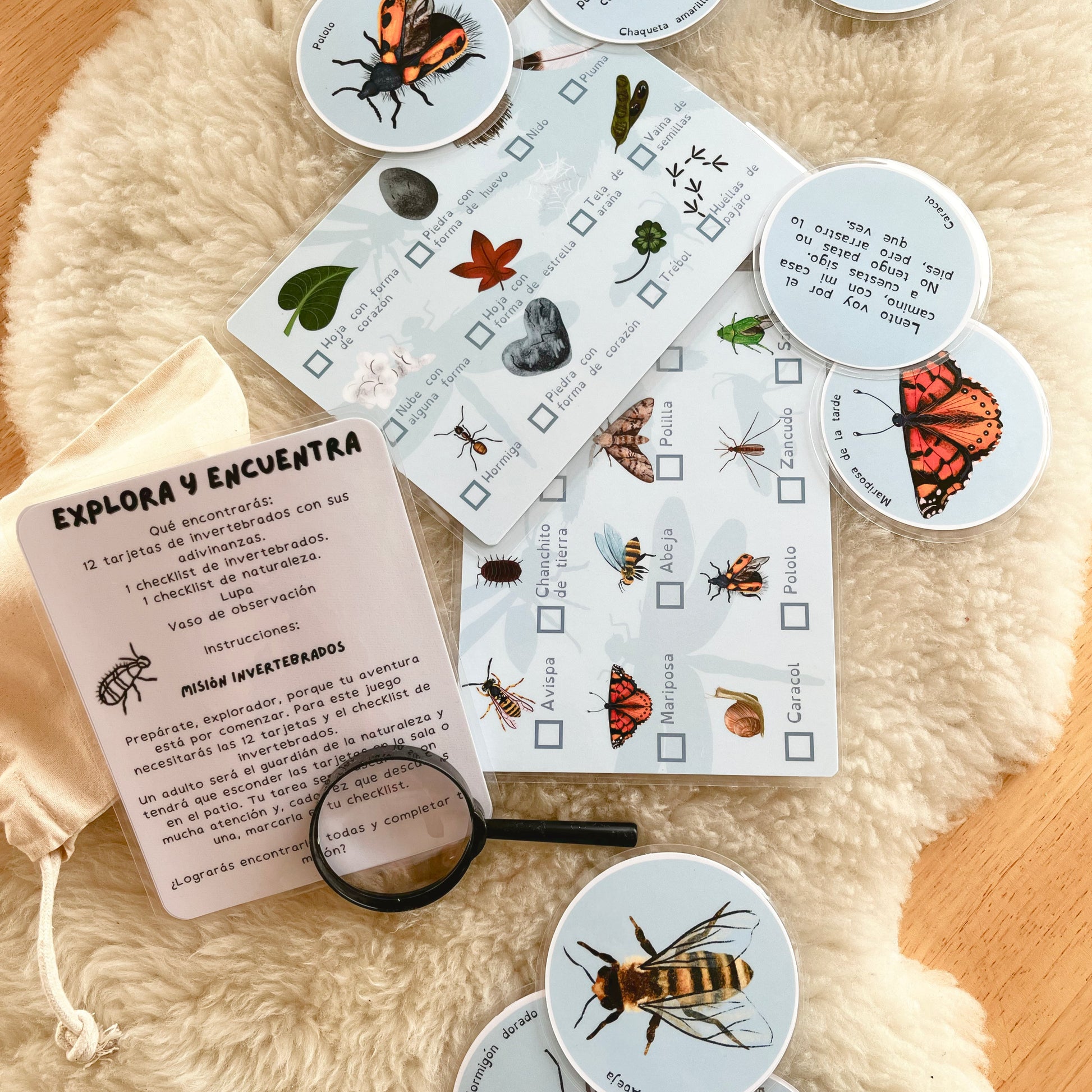 Búsqueda de invertebrados: esconde las fichas y deja que los niños las encuentren mientras marcan el checklist.